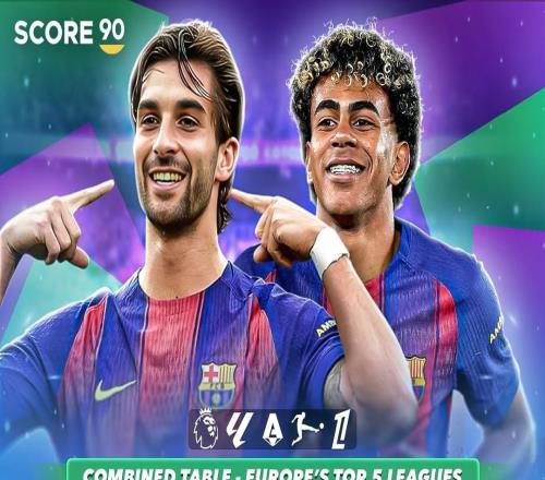 北京时间4月13日,外国媒体score90将五大联赛的排行榜进行了合并,其中巴萨排名第一,拜仁位列第二,国米第三,阿森纳...