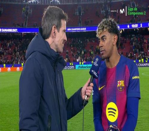 帮助球队在欧冠主场4-1击败哥本哈根拿到前八后,巴萨前锋亚马尔当选全场最佳,赛后接受了Movistar+的采访。