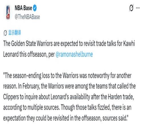 北京时间4月16日,据ESPN名记Shelburne报道,多方消息证实:早在2月哈登交易尘埃落定后,勇士就曾联系快船,询价莱昂纳德。虽然当时的谈判无疾而终,但消息人士透露,双方很可能在今年休赛期重启相关讨论。此前还有报道称,勇士今夏会追求小卡、字母哥和詹姆斯中的一位。