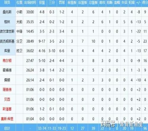 随着这场比赛的落幕,勇士队,尤其是库里,也结束了这个因伤病潮而异常艰难的赛季。38岁的库里此役表现不尽如人意,16次出手仅命中4球,得到17分4篮板视为库里接班人的波杰姆斯基则挺身而出,他17次出手命中多球,砍下23分并摘下10个篮板,交出了两双的优异成绩单。