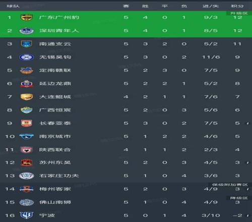 广东另一支球队深圳青年人和广东广州豹的战绩持平4胜1负暂列第二名,这一轮深圳青年人3-1战胜了南京城市,加里塔梅开二度。上赛季的深圳青年人以28分排在倒数第三惊险保级,这个赛季的开局焕然一新,让人眼前一亮。目前保持不败金身的球队只有南通支云和定南赣联,南通支云本轮在客场0-0和陕西联合闷平,两连胜被终结,也是赛季首次单场没有取得进球,目前以3胜2平积11分暂列第三名。