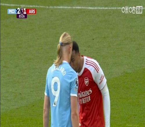 第82分钟,加布里埃尔再次和哈兰德发生冲突,两人头顶头互不相让,最后主裁判安东尼-泰勒各打50大板,一人一张黄牌。