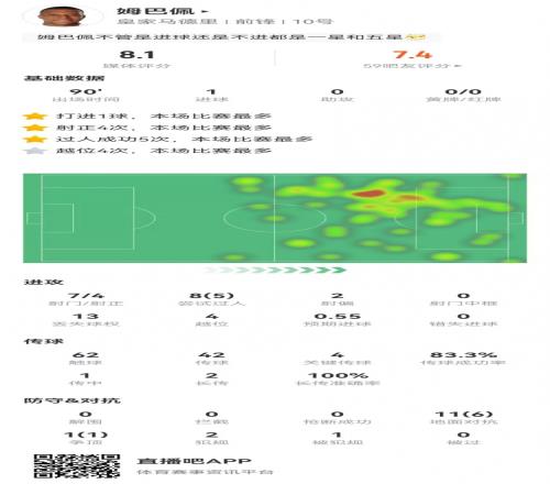 姆巴佩本场7射4正进1球4关键传球+13丢失球权8过人5成功+4越位