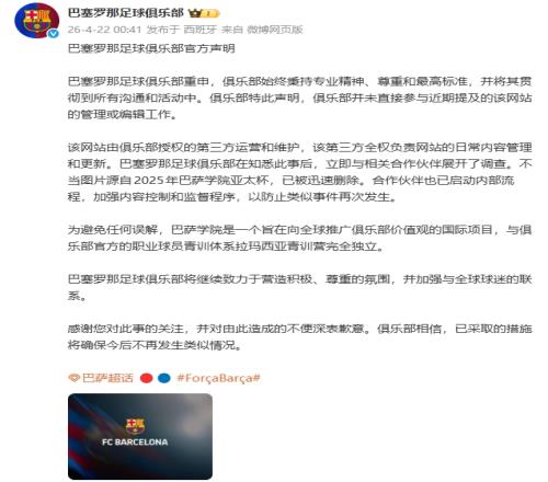 体育播报04月22日宣 巴萨通过微博发布声明,对近期Barça Academy网站出现不当图片内容进行了回应。