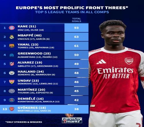 本赛季三叉戟进球榜:拜仁93球断崖领跑、皇萨列二三,枪手仅第13