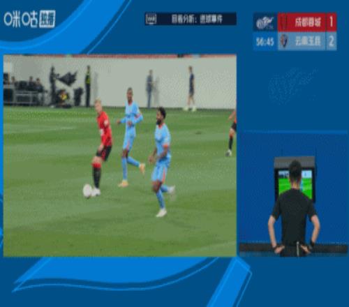 玉昆进球被VAR改判手球无效!第54分钟,黄紫昌右路传中,克莱伯头球摆渡,奥斯卡凌空抽射破门!通过VAR,裁判吹罚卡约手球在先,进球无效!↓