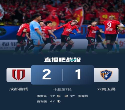 6胜1平领跑!蓉城21逆转玉昆豪取4连胜费利佩制胜玉昆近4轮3负