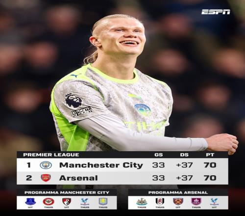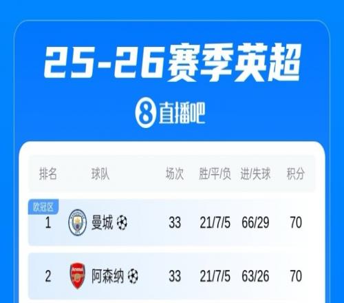 本赛季英超至今,曼城与阿森纳同场次、同积分、同净胜球,都是完赛33场、21胜7平5负积70分、37个净胜球。两队仅进球数和丢球数不同,曼城进66球、丢29球,阿森纳进63球、丢26球。