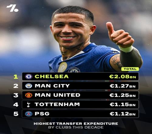 体育播报4月23日宣 OneFootball统计了各俱乐部近10年的引援投入,并列出榜单,切尔西20.8亿欧断层居首,前5名英超俱乐部占4席。