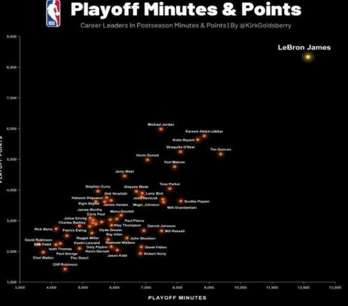 4月23日,数据统计博主Kirk Goldsberry晒出了NBA球员季后赛的出场时间与总得分统计,詹姆斯在点状图中断层领先。