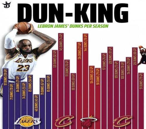 詹姆斯每个赛季扣篮次数一览