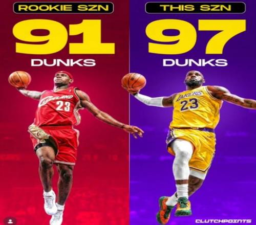 美媒Crazy Stats点评表示:“享受这神级表演吧,你很难想象,跨越22年光阴,41岁的詹姆斯,单季扣篮数超越19岁初入联盟的自己。出场更少、年龄更大,空中统治力不降反升,这不是单纯的状态维持,是违背年龄规律的竞技奇迹。”