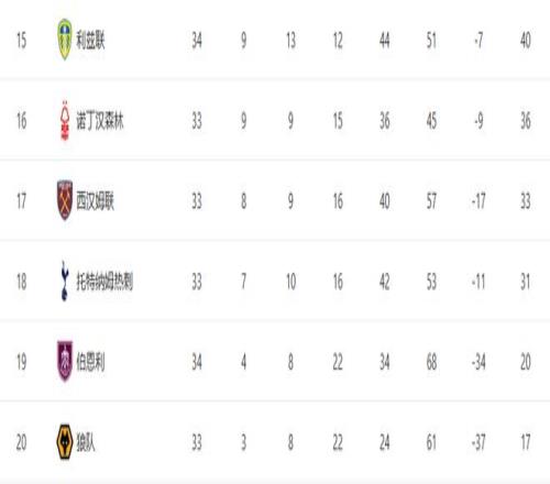 英超贵为五大联赛之首,每个赛季不仅争冠争四相当的刺激,保级大战同样如此,特别是本赛季,有了热刺与诺丁汉森林的加入,关注度更是大大提升,要知道这两支球队上赛季还是欧冠有力的争夺者之一,谁想到本赛季会出现这样的结果,特别是霸占B6名额的热刺,目前伯恩利34轮战罢,仅积20分已经提前4轮降级,外加上已经降级的狼队,英超最后一支降级名额将在4支球队中产生,他们分别是:利兹、诺丁汉森林、西汉姆联和热刺。
