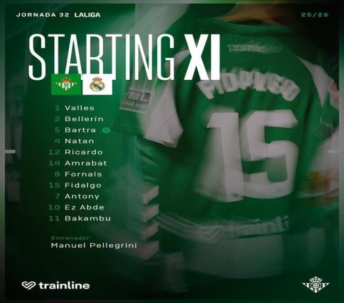 贝蒂斯首发:1-巴列斯、2-贝莱林、5-巴尔特拉、4-德索萨、12-里卡多-罗德里格斯、15-菲达尔戈、14-阿姆拉巴特、7-安东尼、8-福尔纳尔斯、10-阿布德、11-巴坎布