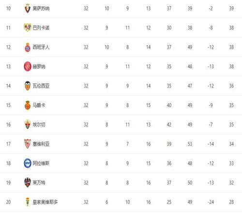 但更夸张的,还不是塞维利亚的崩盘,而是整个西甲保级格局的“全面混战”。从积分榜第10的奥萨苏纳开始,到垫底的奥维耶多,整整11支球队全部被卷入保级漩涡。奥萨苏纳目前也只领先降级区6分,看似安全,实际上只要连续两轮失手,就可能被拖下水。