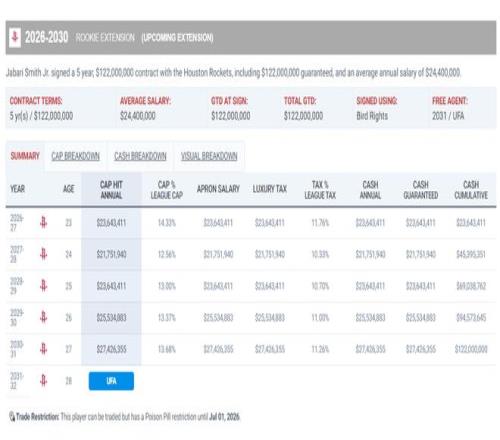 去年夏天火箭跟史密斯签下一份五年1.22亿的合同,这份合同均薪2440万不足2500万,一开始人们还觉得给少了毕竟跟他同届班凯罗、霍姆格伦都是顶薪,如今来看他的球商决定了下限,火箭真没给少。