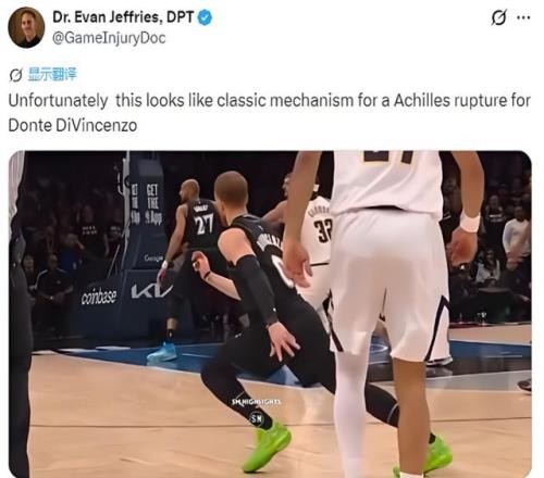 开场不到两分钟,狼队外线迪温琴佐在一次冲抢长篮板中无对抗倒地,随后伤退;很快名记Shams给出了报道确认伤情: