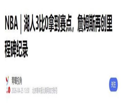 参考资料:青瞳视角2026-04-25 13:30《NBA|湖人3比0拿到赛点,詹姆斯再创里程碑纪录》
