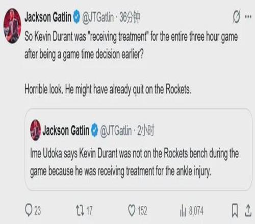 火箭记者Gatlin:“什么治疗要3个小时?他可能已经放弃了球队。”