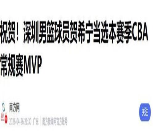 信息来源:祝贺!深圳男篮球员贺希宁当选本赛季CBA常规赛MVP——南方网 2026-04-26