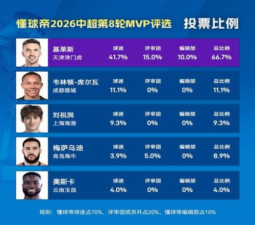 大家好,欢迎来到懂球帝2026赛季中超MVP的评选现场。2026赛季中超第8轮,天津津门虎外援基莱斯梅开二度攻陷工体,以66.7%的得票率高票当选本轮MVP!这也是基莱斯第5次当选中超MVP!