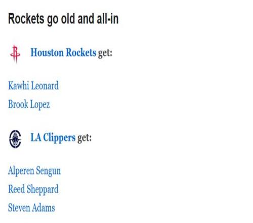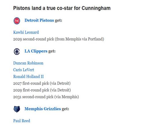 快船得到:邓肯-罗宾逊、卡里斯-勒维尔、罗纳德-霍兰德二世、2027年活塞首轮签、2029年活塞首轮签、2031年灰熊次轮签