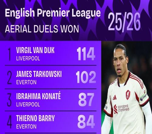 征途国际:本赛季英超赢得空中对抗排名:范戴克第一,塔尔科夫斯基次席