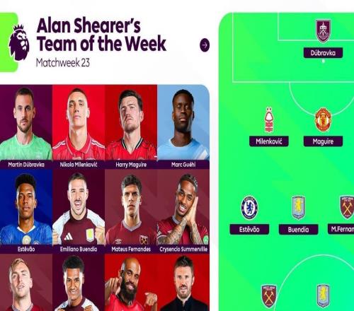 1月27日,英超官方公布了阿兰-希勒评选的第23轮比赛的最佳阵容,其中西汉姆联有3名球员入选,曼联、维拉各有两人,...