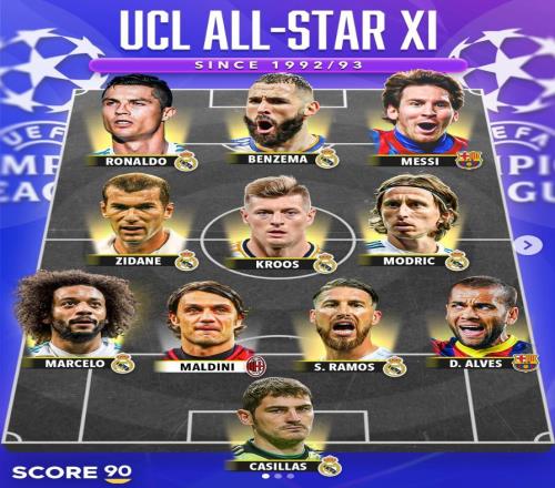 Score90评欧冠改制后全明星阵容:C罗、梅西领衔,皇马8人入选