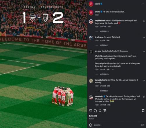 近4场3负!阿森纳球迷心态崩了轰炸官推:年年推迟夺冠塔帅下课