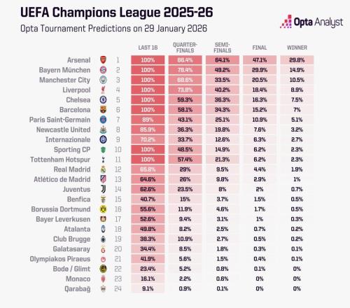 征途国际:Opta更新欧冠夺冠概率:阿森纳29.8%,拜仁14.9%,曼城10.5%
