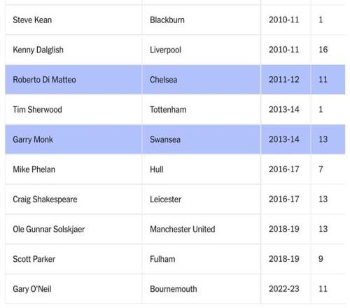 斯科特-帕克甚至或许都不该被纳入这份名单。2018-19赛季2月,在拉涅利下课后,他以助教身份接手富勒姆的临时帅位。尽管三个月后他未能阻止球队降级,但俱乐部仍选择将其扶正,并在随后一个赛季带队成功升回英超。这里并未统计他在英冠的执教成绩,却将接下来那个英超赛季的38场比赛纳入计算——而富勒姆再次降级,因此在数据层面上,他“转正后”的表现显得更为糟糕。
