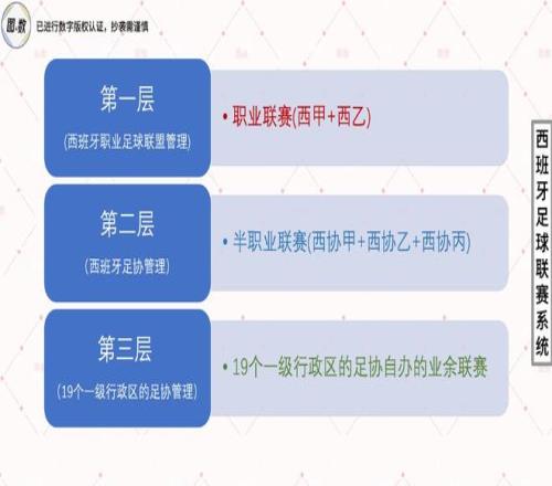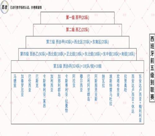 征途国际 在前两期分别发布了西甲地图(20队)和西乙地图(22队),本期将讨论包括西协甲在内的整个西班牙足球联赛系统,它大致可分为三层:第一层是职业联赛,设有西甲和西乙,由西班牙职业足球联盟(Liga Nacional de Fútbol Profesional)运营;第二层是半职业联赛,由西班牙足协运营,分为西协甲、西协乙和西协丙;第三层是第六及以下级别联赛,由西班牙19个一级行政区(17个自治区+2个自治市)的足协自行组织,各地根据自身的具体情况而分设不同级数的赛事,像人口稀少的休达自治市、梅利利亚自治市和拉里奥哈自治区均只有一个级别的联赛,而加泰罗尼亚自治区则有五级联赛(精英级/甲级/乙级/丙级/丁级),排在最低的加泰罗尼亚第五级、即全国第十级的加泰丁设有多达35个平行分组,每组都是十来个队,合在一起意味着仅一项赛事就有大约四百支球队。