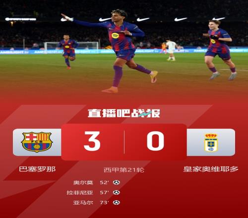 1月26日宣 北京时间1月25日23点15分,西甲第21轮中,巴塞罗那在诺坎普球场迎战皇家奥维耶多。比赛上半场,巴萨前锋莱万错失了一些良机。进入下半场后,皇家奥维耶多出现两次失误,巴萨的奥尔莫和拉菲尼亚分别把握住机会进球,最终由亚马尔精彩的侧钩锁定了胜局。比赛结束时,巴萨以3-0战胜皇家奥维耶多。这场胜利使得巴塞罗那积累了52分,重新夺回积分榜榜首位置,领先皇家马德里1分,而皇家奥维耶多则以仅有13分继续排名垫底。