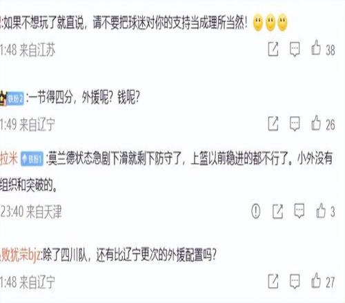 在输给了新疆后,不少辽宁球迷赛后跑到辽宁官方账号下留言表达不满,矛头直接指向管理层:如果不想玩了就直说,请不要把球迷对你的支持当成理所当然!除了四川队,还有比辽宁更次的外援配置吗?俱乐部不出来说点啥吗?别老让教练和球员背锅了!