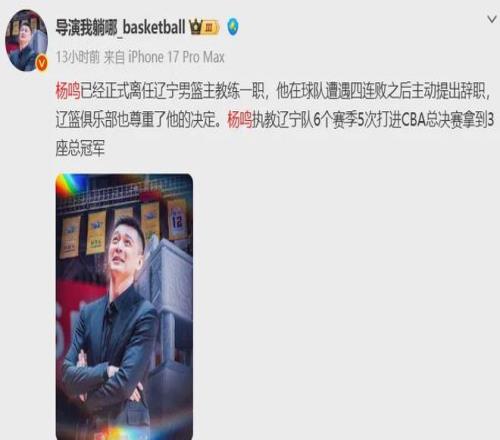 据媒体人透露,辽宁队决定接受杨鸣的辞职决定,外教乌戈将担任球队新帅职务。