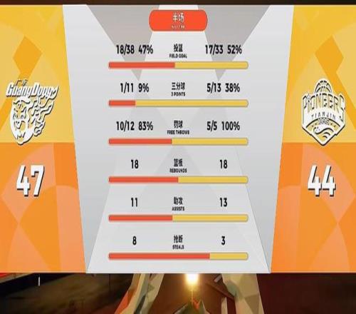 这一节两队你追我赶,广东和天津的单外援阵容打的不亦乐乎,场上菜鸡互啄,半场战罢广东凭借奎因萨姆纳半场合力砍下的33分,艰难47-44领先天津,上半场广东三分11中1,本土球员仅得10分,天津飚进5记三分,本土球员拿到23分,谷泽裕半场13分8助,一人打爆胡明轩杨溢。