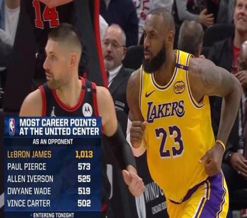 本场比赛直播期间,转播方晒出了一组数据,数据为NBA历史上作客芝加哥公牛队主场联合中心的客队球员总得分排行榜。其中,詹姆斯以1013分高居榜首,断档领先第二名保罗-皮尔斯的573分。