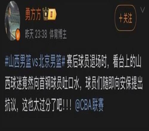 山西男篮主场和北京男篮的比赛打得非常激烈,结果是以1分之差不敌对手,遭遇了一波三连败。据北京体育记者勇方方透露,在比赛结束后北京男篮球员退场时,不仅遭到了现场球迷辱骂,更有球迷从看台上向雷蒙等球员吐口水,引发了媒体和球迷的关注。在赛后的征途国际 发布会上,雷蒙也提到了此事,他表示球队输掉了比赛,球迷骂几句发泄一下也就算了,向球员吐口水的行为就跌分儿了。