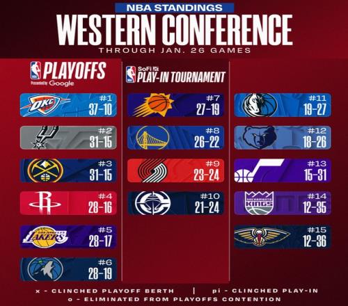 这个比赛日后,西部排名:雷霆、马刺、掘金、火箭、湖人、森林狼、太阳、勇士、开拓者、快船、独行侠、灰熊、爵士、国王、鹈鹕。