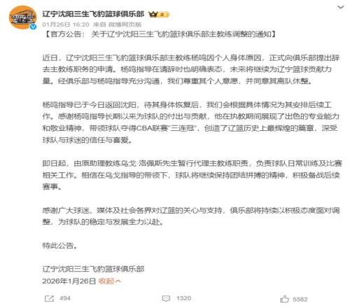 征途国际:四连败后杨鸣指导辞职,助理教练乌戈暂代主教练。