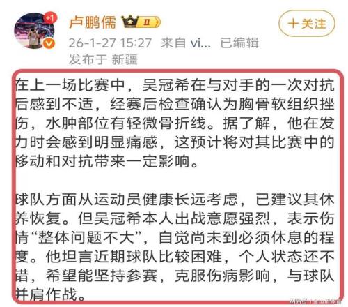 肋骨骨裂咬牙坚持上场,篮下10中9拿下准两双,吴冠希,真正的硬汉!