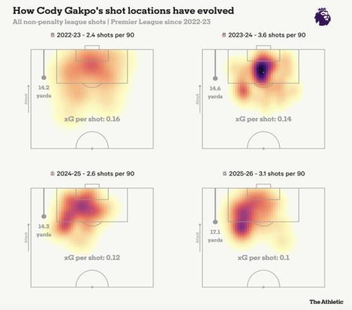 数据同样印证了肉眼所见。加克波下滑的一个关键原因是射门选择。下面的射门分布图显示,他更多选择在禁区左侧边缘、距离较远的位置进行冒险射门,而不是进入更具威胁的中路区域。