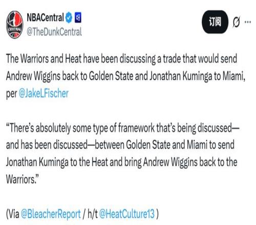 北京时间1月28日,据名记Fischer报道,勇士与热火之间确实正在谈判,而且此前也一直在磋商一套交易框架,核心内容是将库明加送至热火,让维金斯重返勇士。