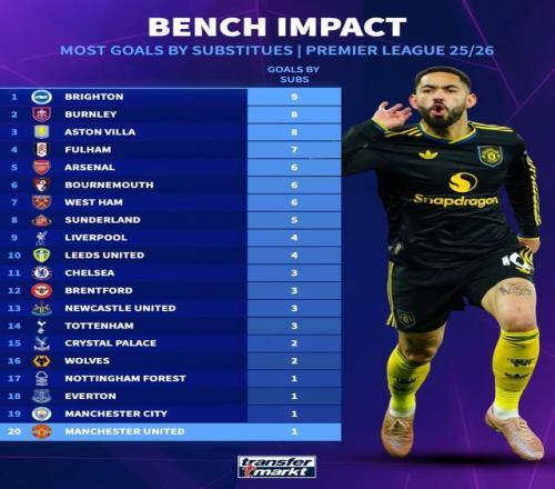 本赛季英超球队替补进球榜:布莱顿9球第1,曼城、曼联1球垫底