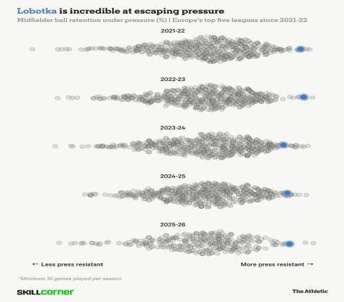 多年来,这位身材矮小的斯洛伐克中场一直是欧洲最擅长抗压控球的球员之一。当The Athletic向他展示SkillCorner数据,证明他在高压下的控球能力时,洛博特卡腼腆地表示:“我真的很惊讶自己能这么出色。”