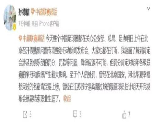 不过,既然是召开发布会公开宣布,那无论是名单公布还是处罚措施,都应该力度不小,不然也不会如此大张旗鼓。值得一提的是:孙德信给出了两个比较明确的信息,其一是曾在北京国安、河北华夏幸福待过的名宿肯定上榜,其二是曾在江苏苏宁踢过球的现役球员估计将要结束职业生涯。