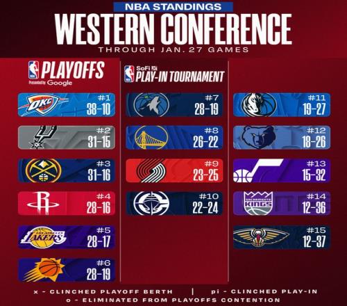 北京时间1月28日,NBA常规赛打完后,西部的格局再度发生了些许变化,超级残阵的太阳重返西部第六,森林狼掉回西部第七;开拓者爆冷不敌东部倒二的奇才,他们的胜场已经跟快船持平,因为快船拿到三连胜,快船摆脱西部第十只是时间问题。