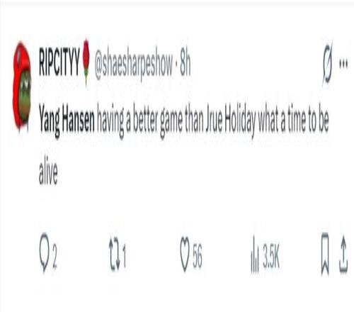 赛后开拓者球迷、开拓者媒体、美国媒体都为杨瀚森此役的表现点赞:克林根与萨尔发生了一次冲突导致球队的胜利溜走,而杨瀚森在场+11明显更出色,可斯普利特却不让他在关键时刻参与防守。