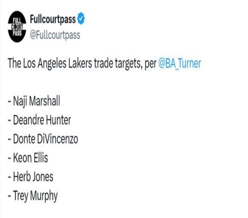 湖人队记布拉德-特纳撰文称:“据多位NBA内部人士透露,与湖人队传出绯闻的潜在引援目标包括达拉斯独行侠队的纳吉-马绍尔——他曾是东契奇的队友,此外还有克利夫兰骑士队的德安德烈-亨特、明尼苏达森林狼队的唐特-迪文琴佐以及萨克拉门托国王队的基翁-埃利斯。新奥尔良鹈鹕队的特雷-墨菲三世和赫伯特-琼斯也是湖人表现出兴趣的两名球员,联盟中多支球队同样对他们有意。不过据NBA消息人士透露,鹈鹕对这两人的要价极高,各队都在观望,等待其在下周交易截止日前是否会降低筹码。”